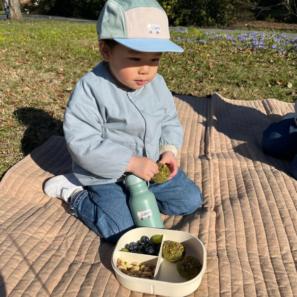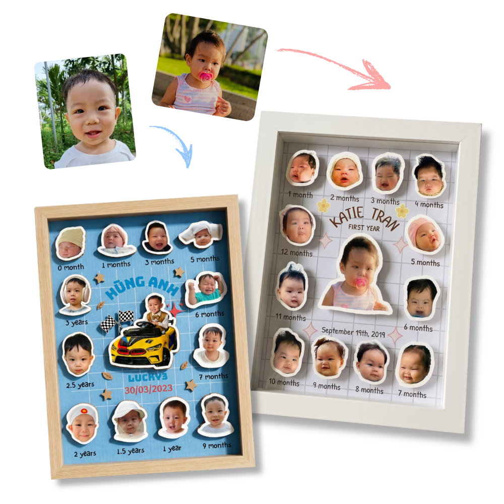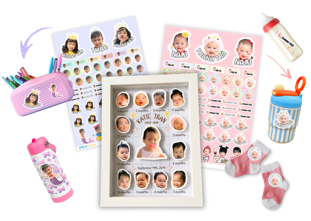 Nhãn tên chống nước · Chibi sticker mặt bé · Khung milestone First Year — cá nhân hóa 100%, giao nhanh nội thành.