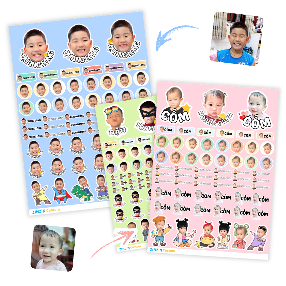 Gửi ảnh bé, nhận sticker chibi dễ thương với khuôn mặt bé thật. Dán bình nước, hộp cơm, vali — đâu cũng cute!