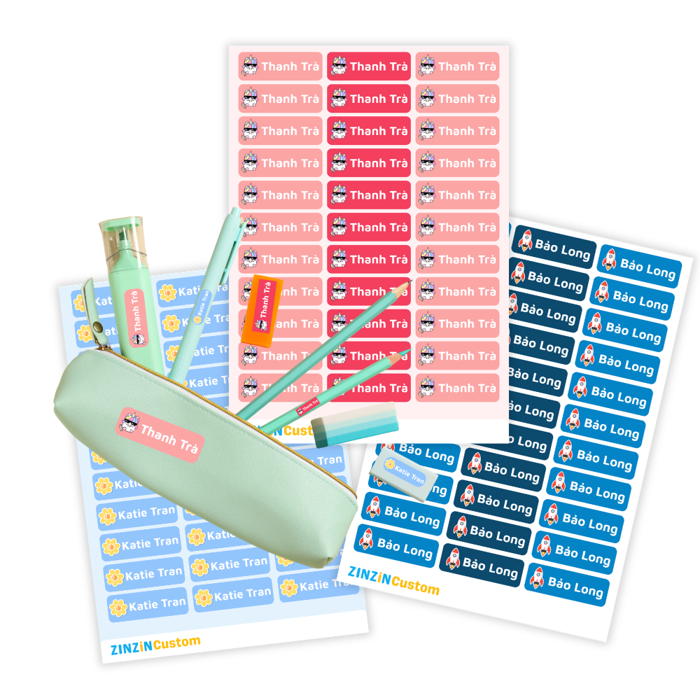 Dán bình nước, hộp cơm, sách vở, bút, balo — không bong, không nhòe. Set 50–200 miếng với 3-5 kích thước.