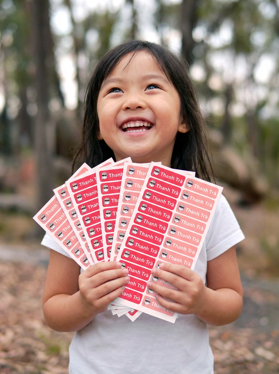 Không có MOQ tối thiểu. Set nhỏ nhất bắt đầu từ 50 miếng nhãn tên — phù hợp cho mẹ dùng cá nhân lẫn mua làm quà tặng.